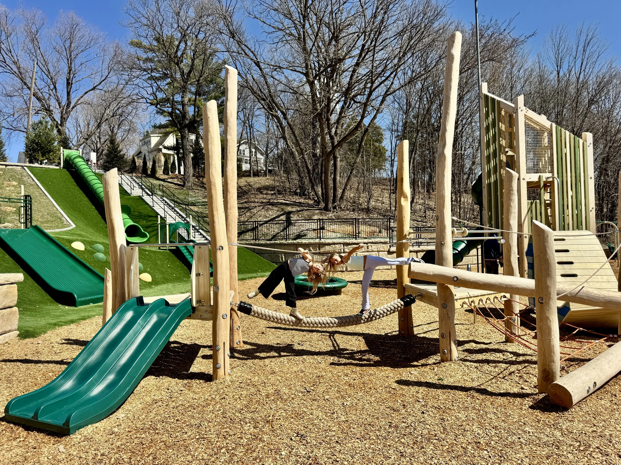 At Klapprich Park in Wayzata, MN, for example, a steep back hill could have been a design problem. Instead, the team used it for embankment play by installing slides into the slope so kids can scramble up and glide down while caregivers watch from level ground. The grade does the work, which means less structural steel, less cut-and-fill, and a play experience that truly belongs to that specific park.